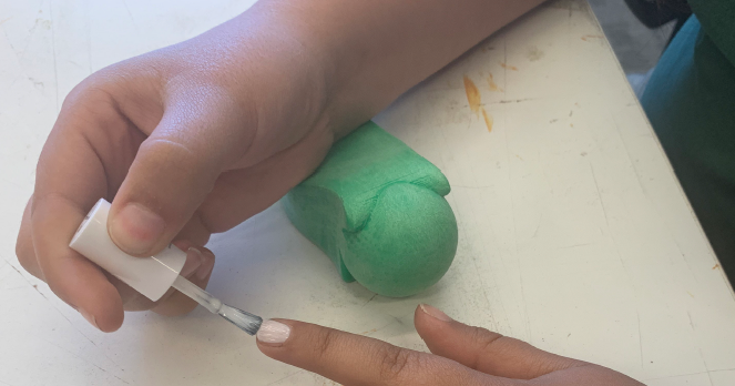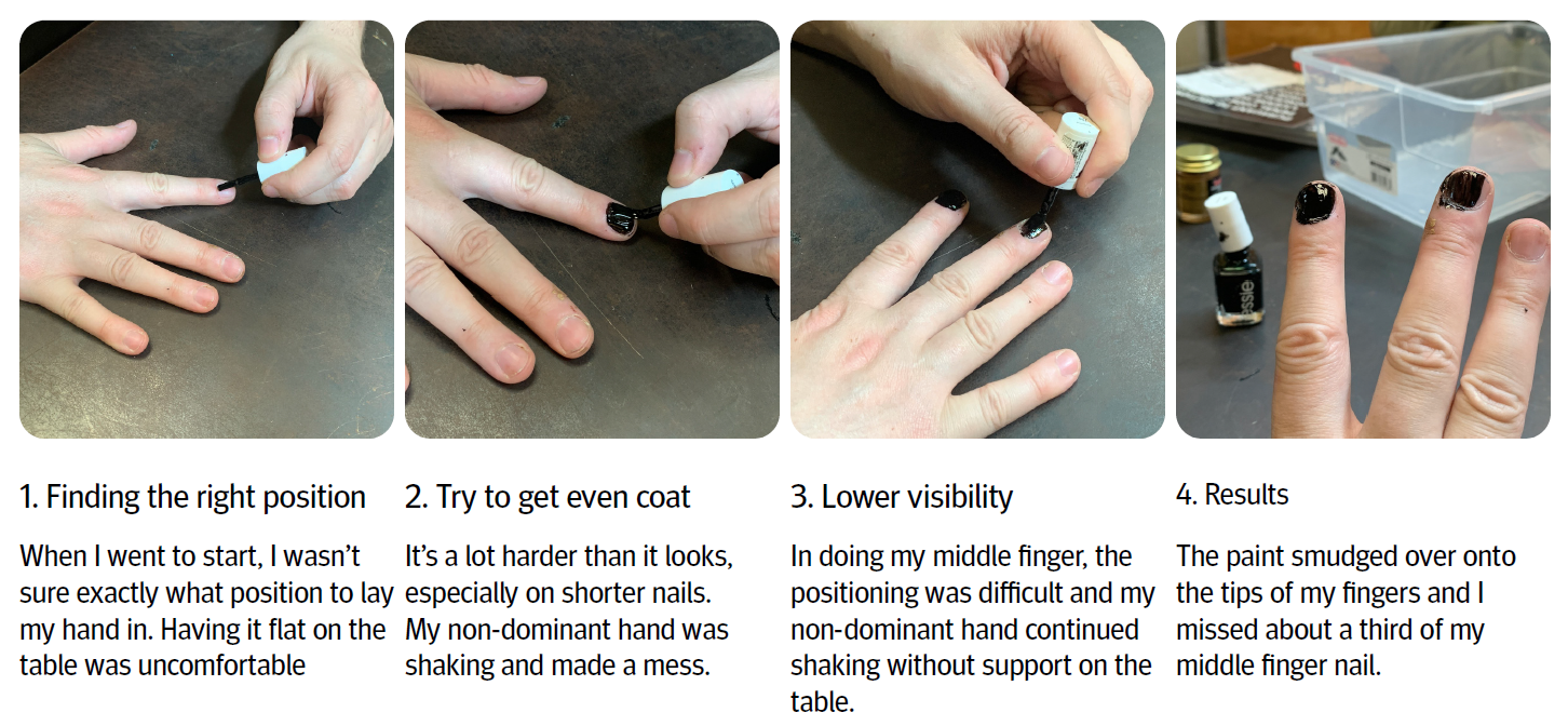 Having never painted my nails before, I took the opportunity to try. It was a difficult task because my hands kept shaking. From that point, I set out to create a tool that could help stabilize the user's hand while using nail art tools.